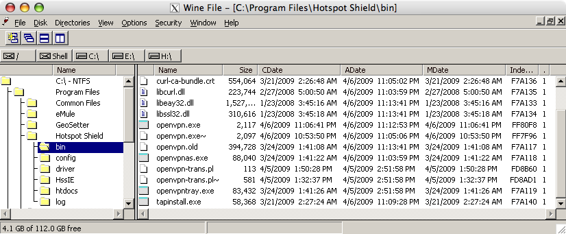 With the openvpn.exe turning out not being a good cutting point for an interoperability patch, there is still an option left. The main problem of Hotspot Shield not running in wine is that it won’t be able to load a network driver into the kernel of the host OS. This particular driver, the ethernet network tap however came in fact from the Unix world and had been ported to Windows. So the remaining option would be to implement the Windows interface of the TAP-Win32 driver and map its calls to the native TAP driver. For me that is more time worth spending.
