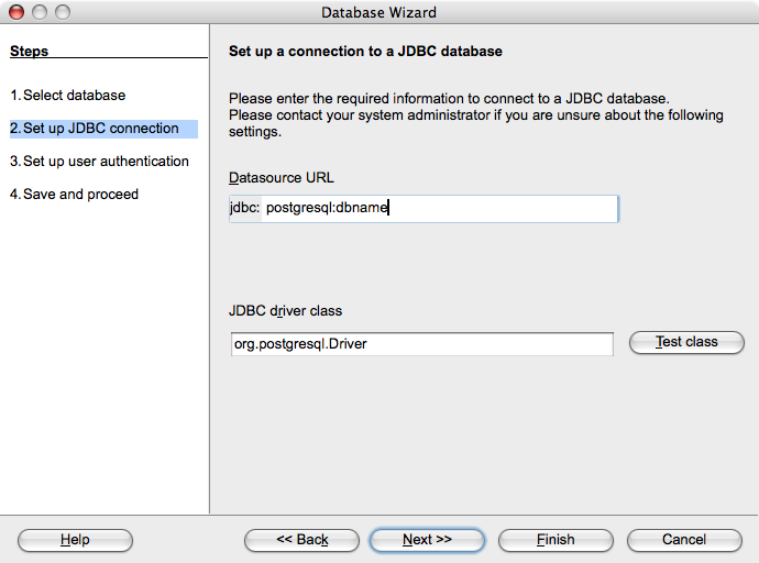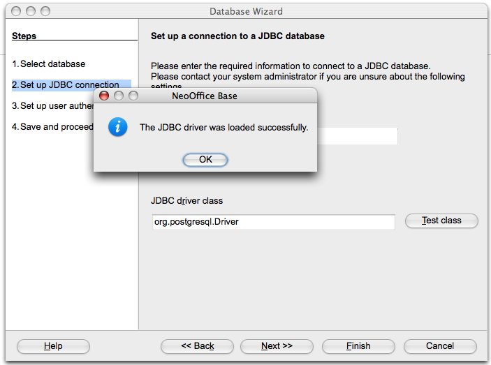 - Configure the JDBC source in NeoOffice. The Datasource URL is jdbc:postgresql:$dbname (where $dbname is the name of your database). The JDBC driver class is org.postgresql.Driver